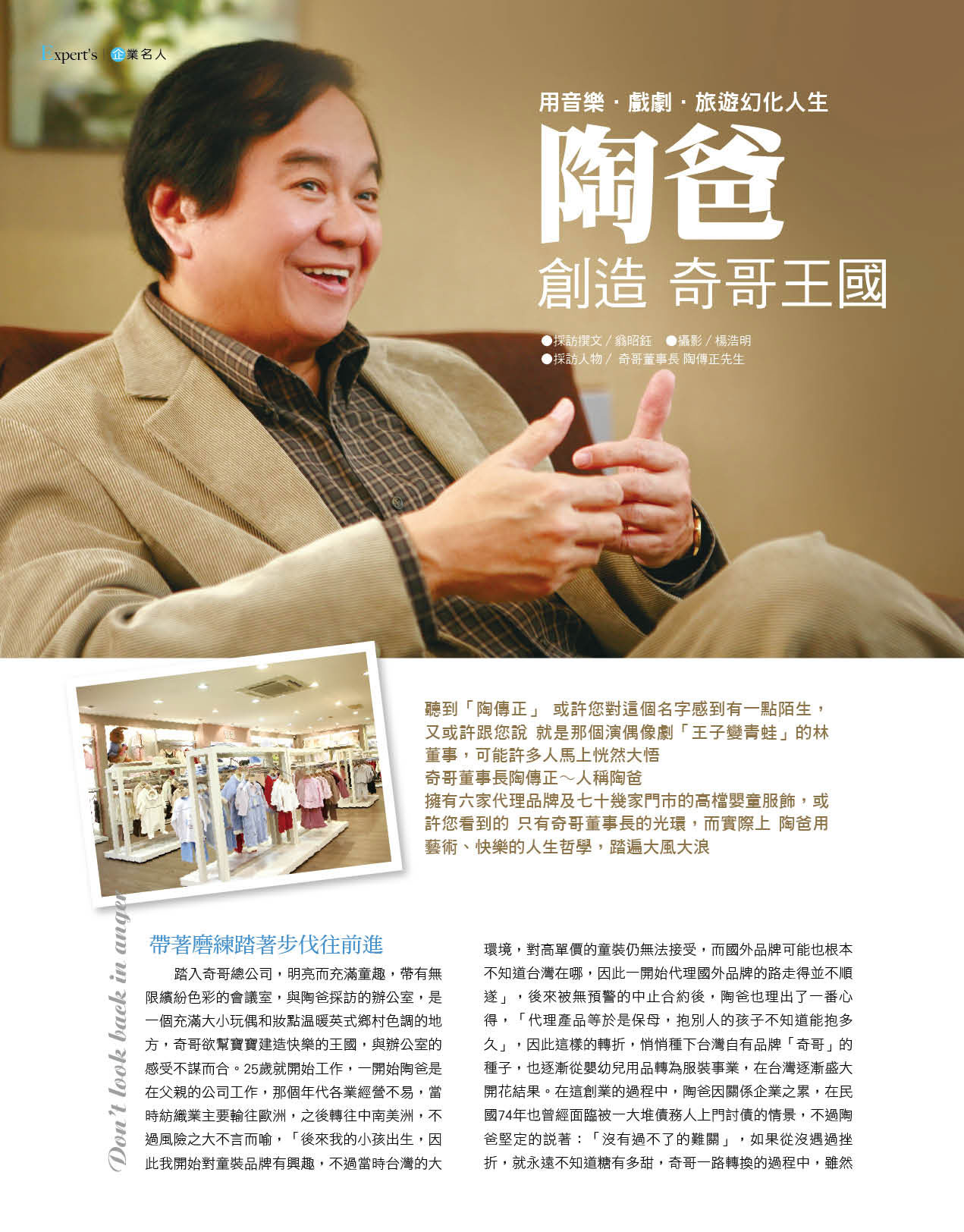 奇哥董事長陶傳正人稱陶爸,有六家代理品牌及七十幾家門市的高檔嬰童服飾,或許您看到的,只是奇哥董事長的光環,而實際上,陶爸用藝術、快樂的人生哲學,踏遍大風大浪。